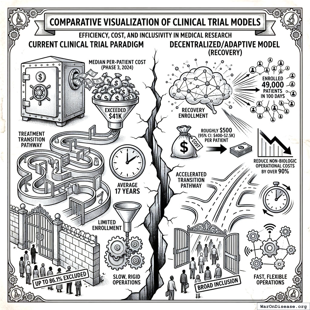- The U.K. RECOVERY pragmatic trial enrolled 49,000 patients in 100 days at roughly $500 (95% CI: $400-$2,500)[3], demonstrating that a decentralized, adaptive model can reduce the non-biologic operational costs of clinical research by over 90 percent through automation of data management, monitoring, and administrative functions.