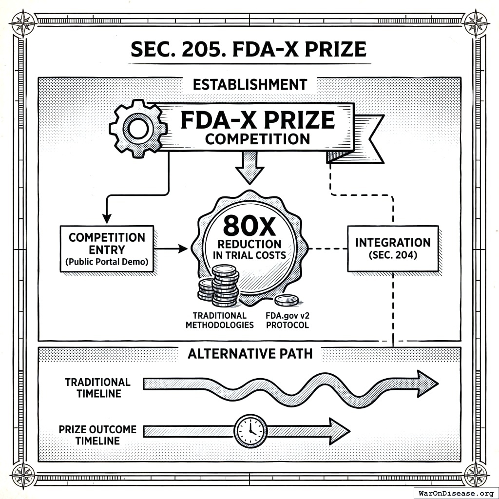 - Establishment. To accelerate the development of the FDA.gov v2 Protocol, the Secretary is authorized to establish an “FDA-X Prize” competition, with a prize purse to be determined by the Secretary, awarded to the entity that first develops and demonstrates a public portal meeting the core requirements outlined in Section 204 and which demonstrates the capacity to achieve at least an 80X reduction in per-patient trial costs compared to traditional methodologies.