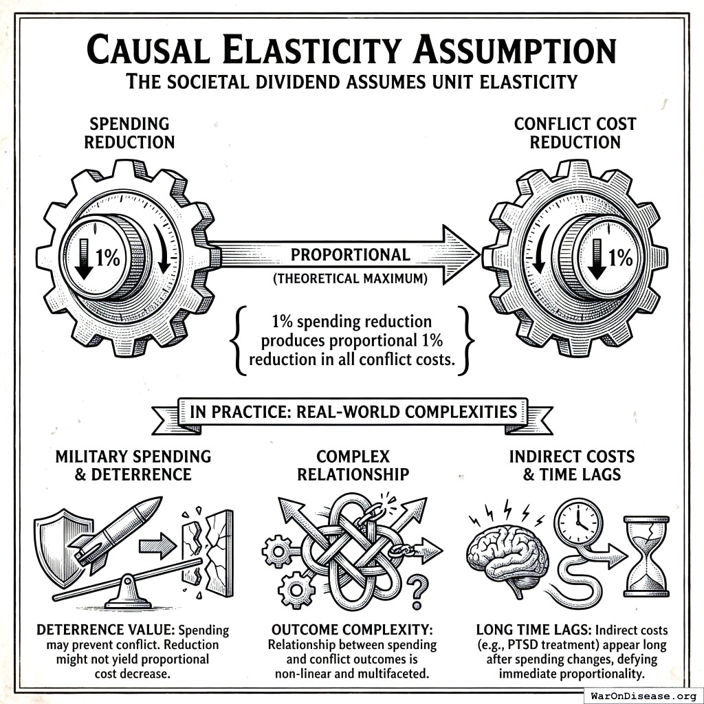 The elasticity parameter asks the only interesting question here: once you’ve already captured the guaranteed $27.2 billion, how much of the additional $86.4 billion (95% CI: $62.9 billion-$113 billion) actually materializes? If you cut military spending 1%, do the wider war costs actually drop too? Or do humans, being humans, find a way to keep killing each other at full price?