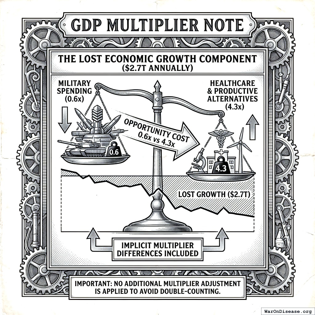Spend a dollar on weapons, get 60 cents of economic value. Spend a dollar on healthcare, get $4.30 back. Your species chose weapons. Every time. For centuries. On Wishonia, this would be considered evidence. On Earth, it is considered an anecdote, which is what humans call evidence when they don’t want to act on it. The Lost Economic Growth component ($2.72 trillion (95% CI: $1.9 trillion-$3.8 trillion)) already captures this difference. It’s not double-counted, just consistently ignored.