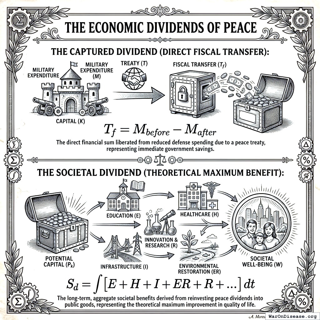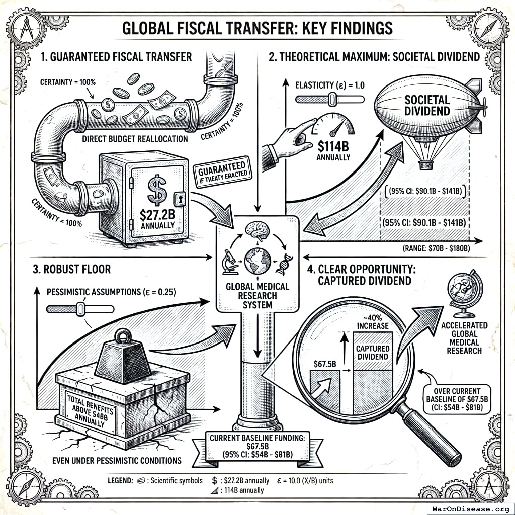 For policy decisions, use the Captured Dividend ($27.2 billion) as the reliable number. Money moved directly to medical research. No assumptions about whether humans will fight less. Just a bank transfer from the explosion account to the medicine account.