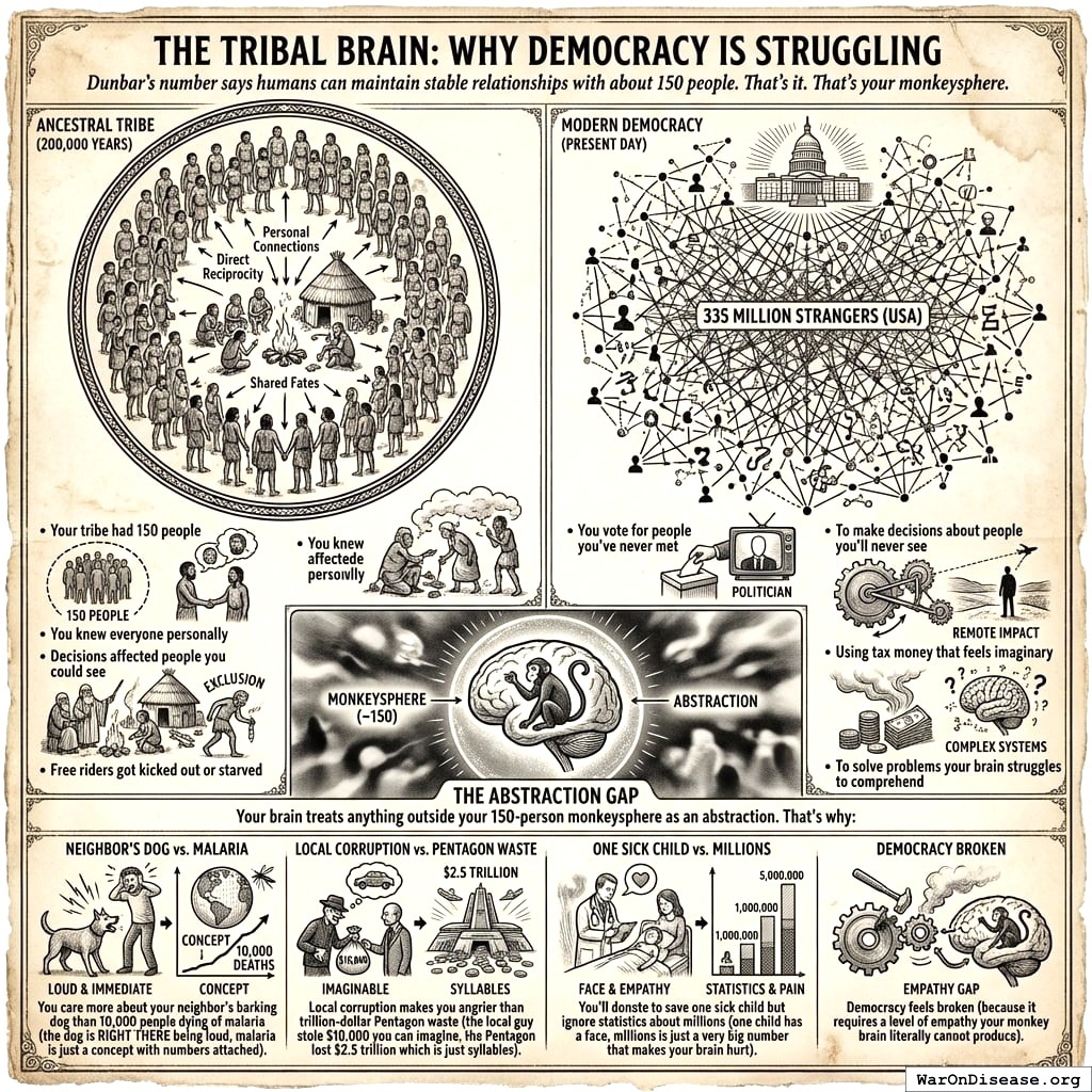 Your brain treats anything outside your 150-person monkeysphere as an abstraction. You care more about your neighbor’s barking dog than 10,000 people dying of malaria, because the dog is RIGHT THERE being loud and malaria is just a concept with numbers attached. Local corruption makes you angrier than trillion-dollar Pentagon waste, because the local guy stole $10,000 you can imagine, while according to DOD audit failures the Pentagon lost $2.5 trillion, which is just syllables. You’ll donate to save one sick child whose face you can see but ignore statistics about millions, because one child has eyes and millions is just a very big number that makes your brain hurt and then change the channel.
