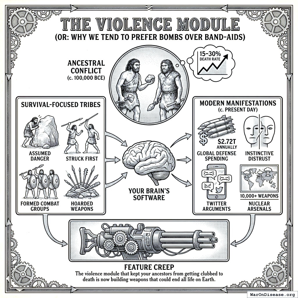 15-30% of your ancestors died from violence147. Not disease. Not starvation. Other humans, smashing their heads with rocks over territorial disputes about berry bushes. You’ve since upgraded the rocks to intercontinental ballistic missiles, but the berry bush energy remains. This is what biologists call “conserved behavior.” It means the behavior has been preserved across millions of years because it was so useful that evolution never bothered to remove it. On your planet, it’s the reason you spend more preparing to kill each other than preparing to not die. The behavior was designed for a world where the stranger approaching your camp might eat your children. In that world, it was rational. In a world with nuclear weapons, it’s the reason I’m writing this manual.