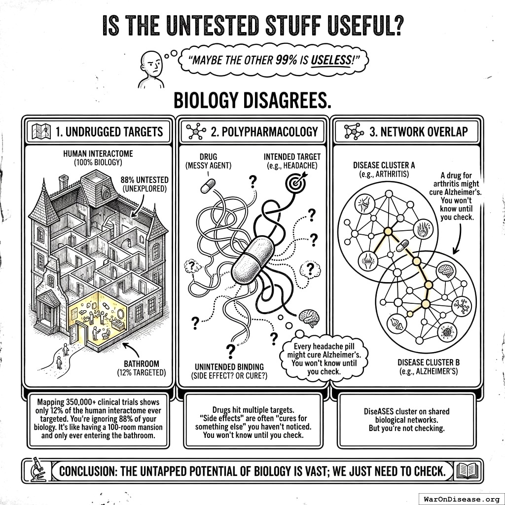 You’re ignoring 88% of your own biology. Mapping 350,000+ clinical trials showed that only 12% of the human interactome has ever been targeted by drugs. You have a 100-room mansion. You live in the bathroom. You have decorated the bathroom very nicely. You have published papers about the bathroom. The other 88 rooms are locked, and when someone asks about them, you say “we’re focused on bathroom excellence at this time.”