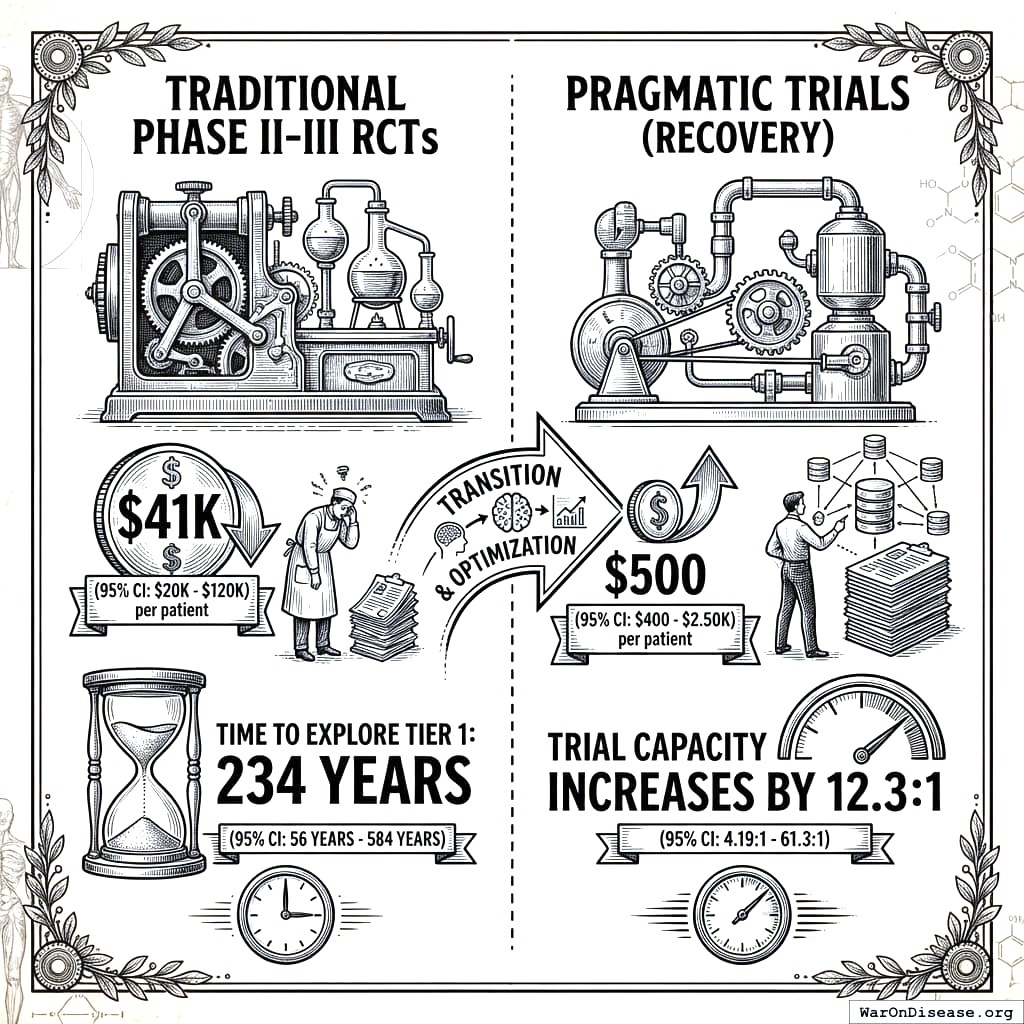 10.5281/zenodo.18243914 Only 15 diseases/year get their first treatment each year. With 6.65 thousand diseases lacking effective treatments, the backlog would take 443 years to clear. Integrating pragmatic trials into standard healthcare increases trial capacity 12.3x, cutting that timeline from 443 years to 36 years. The average untreated disease gets a treatment 212 years earlier, saving 10.7 billion deaths at $0.842 per year of healthy life saved.