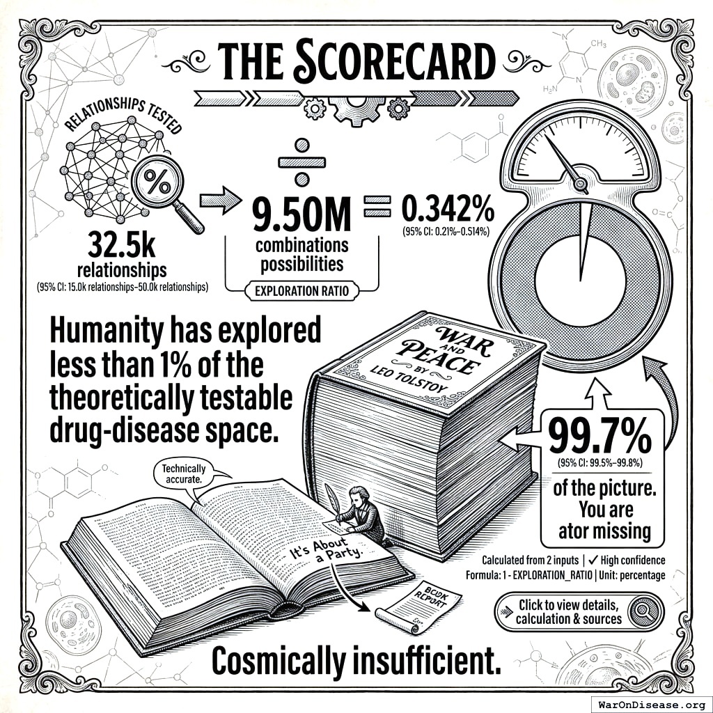 I want to sit with that for a moment. You have safe compounds. You have sick people. You have the ability to introduce them to each other. You have done this 0.342% (95% CI: 0%-1%) of the time. The other 99.66% of introductions have never been made. Not because they wouldn’t work. Because the molecule didn’t have a marketing budget.