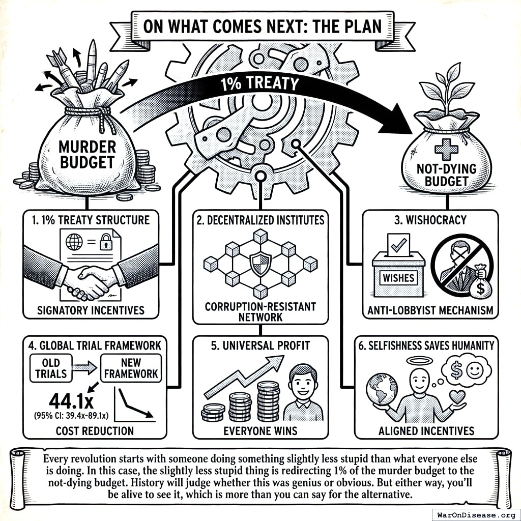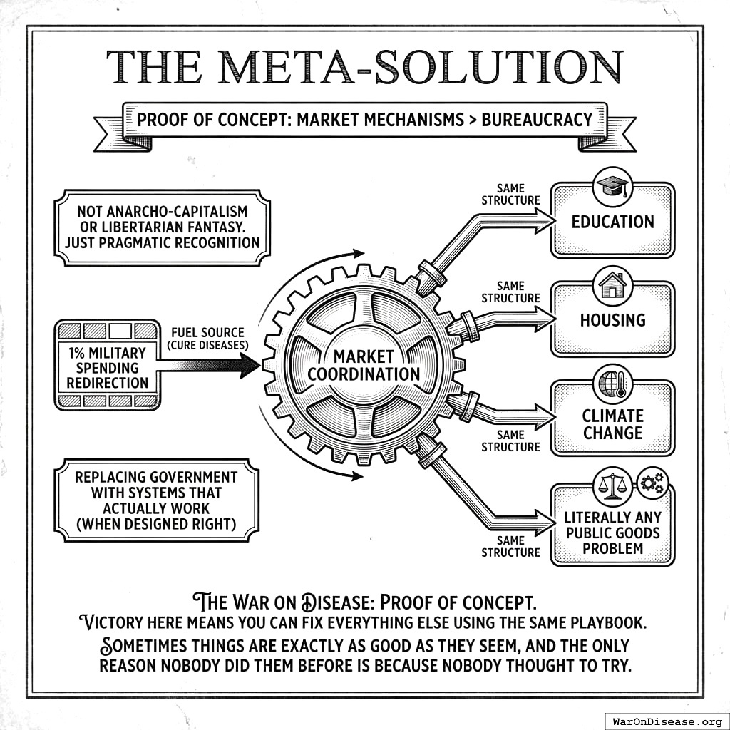 This solution isn’t just about ending disease. It proves that paying people for results works better than paying people for promising results (a distinction your species has been avoiding for centuries). You can cure diseases by redirecting 1% of murder money through markets. That same template solves education, housing, climate change, and literally any problem your governments currently solve by forming a committee to discuss forming a committee.