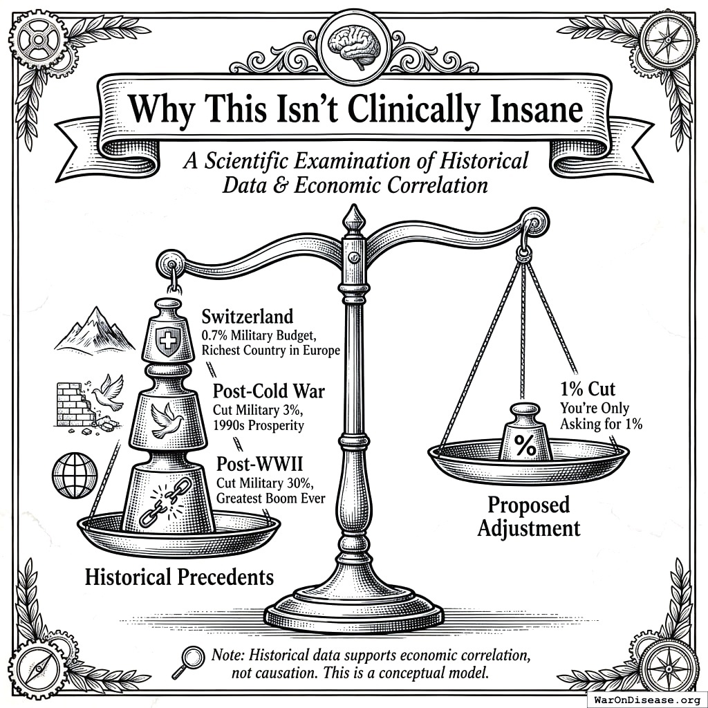 war-on-disease, 1-percent-treaty, medical-research, public-health, peace-dividend, decentralized-trials, dfda, dih, victory-bonds, health-economics, cost-benefit-analysis, clinical-trials, drug-development, regulatory-reform, military-spending, peace-economics, decentralized-governance, wishocracy, blockchain-governance, impact-investing