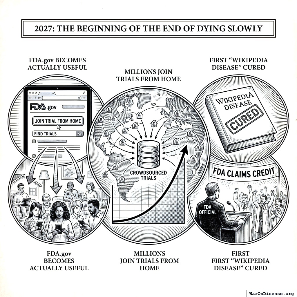 FDA.gov becomes actually useful. Millions join trials from home. The first “Wikipedia disease” gets cured entirely through crowdsourced trials. The FDA claims credit.