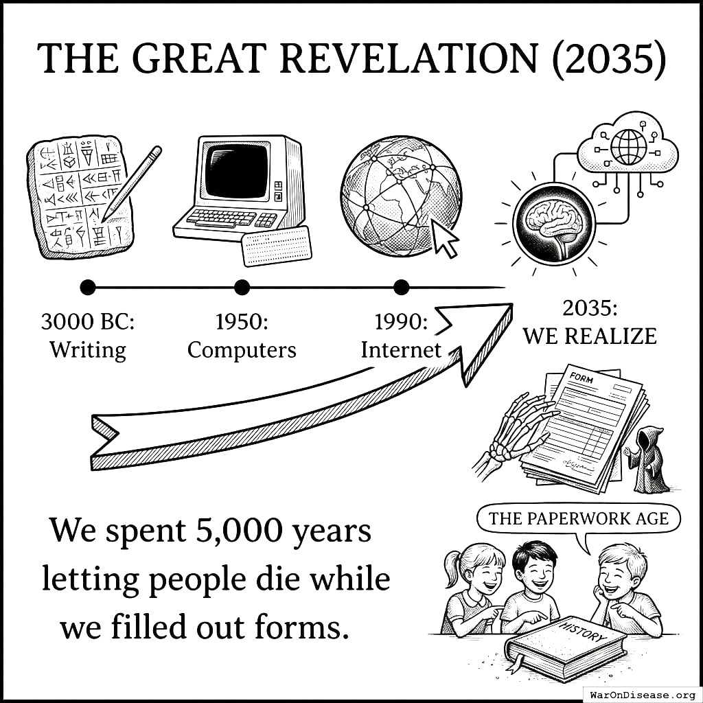 Five thousand years of letting people die while filling out forms. History books will call this “The Paperwork Age.” Children will laugh.
