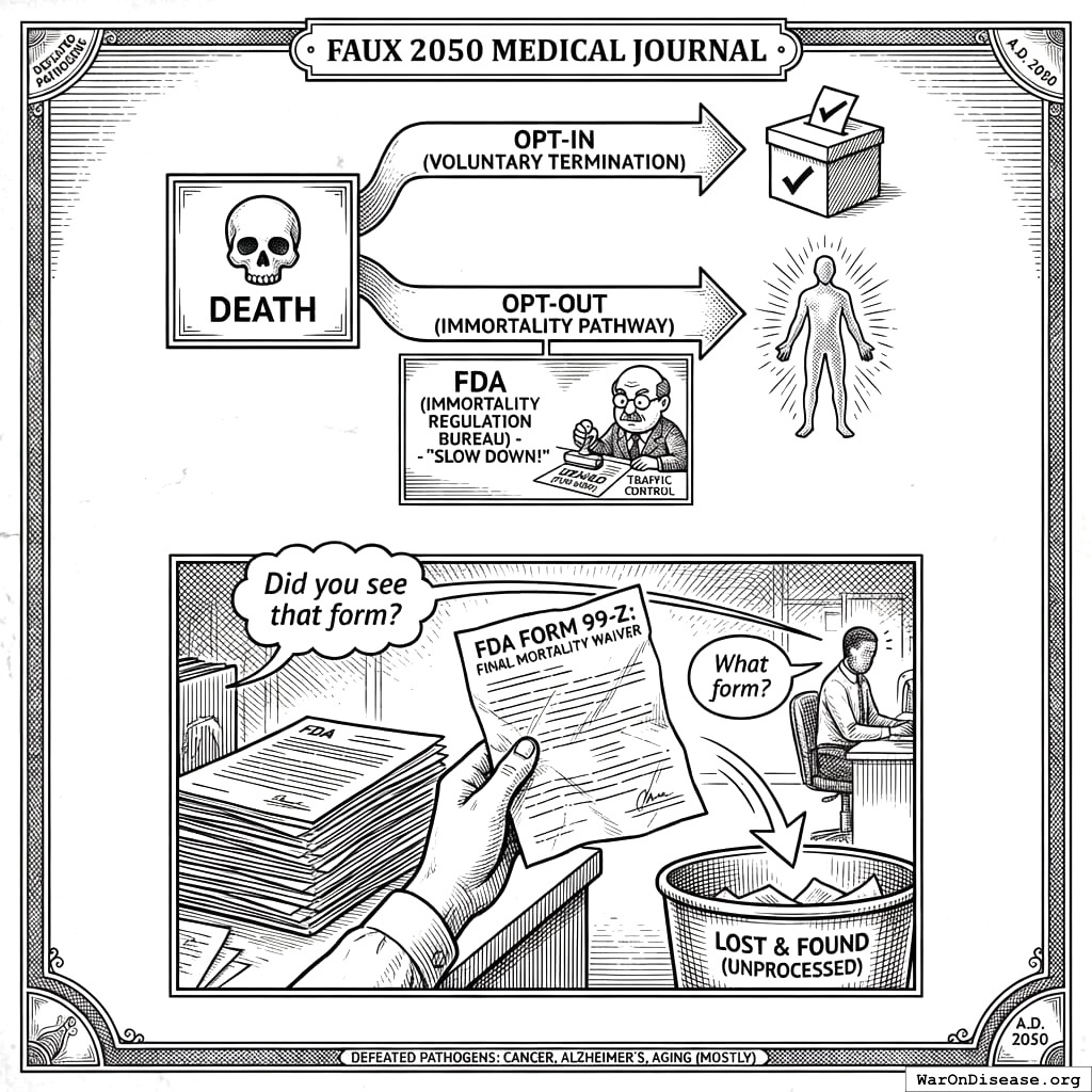 Diseases are mostly solved. Death becomes a choice, like smoking or voting for the Uniparty. The FDA’s job becomes preventing people from becoming immortal too quickly (traffic is bad enough).