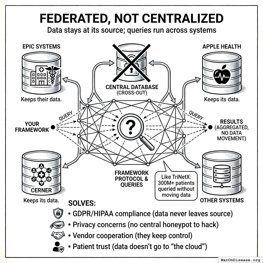 Your decentralized protocol runs queries across systems without moving data. Like asking every library in the world a question without stealing their books. Federated data networks already do this with 300M+ patient records.