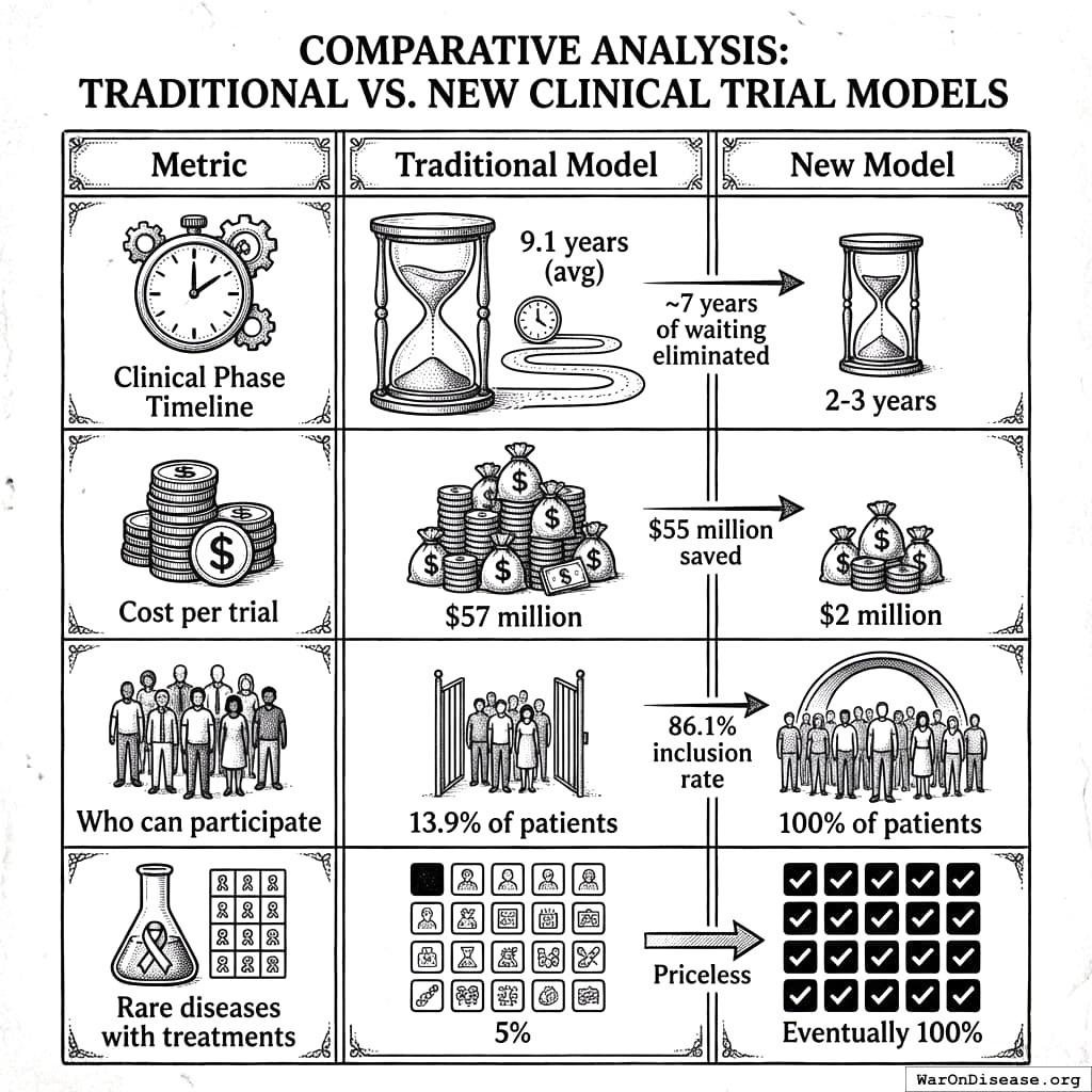 How we do clinical trials now: slow, expensive, broken. How we could do them: fast, cheap, working. The difference is stark.