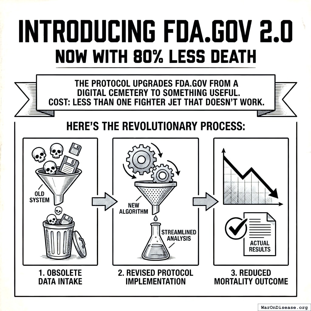 The protocol upgrades FDA.gov from a digital cemetery to something useful. Cost: less than one fighter jet that doesn’t work.
