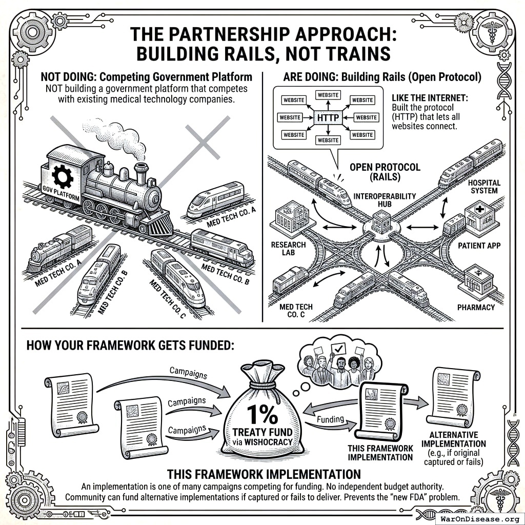 How it gets funded: An implementation of this framework is one of many campaigns competing for funding from the 1% Treaty Fund via Wishocracy160. No independent budget authority. If one implementation gets captured or fails, the community funds a different one. This prevents the “new FDA” problem (where you build a second bureaucracy that becomes the first bureaucracy).