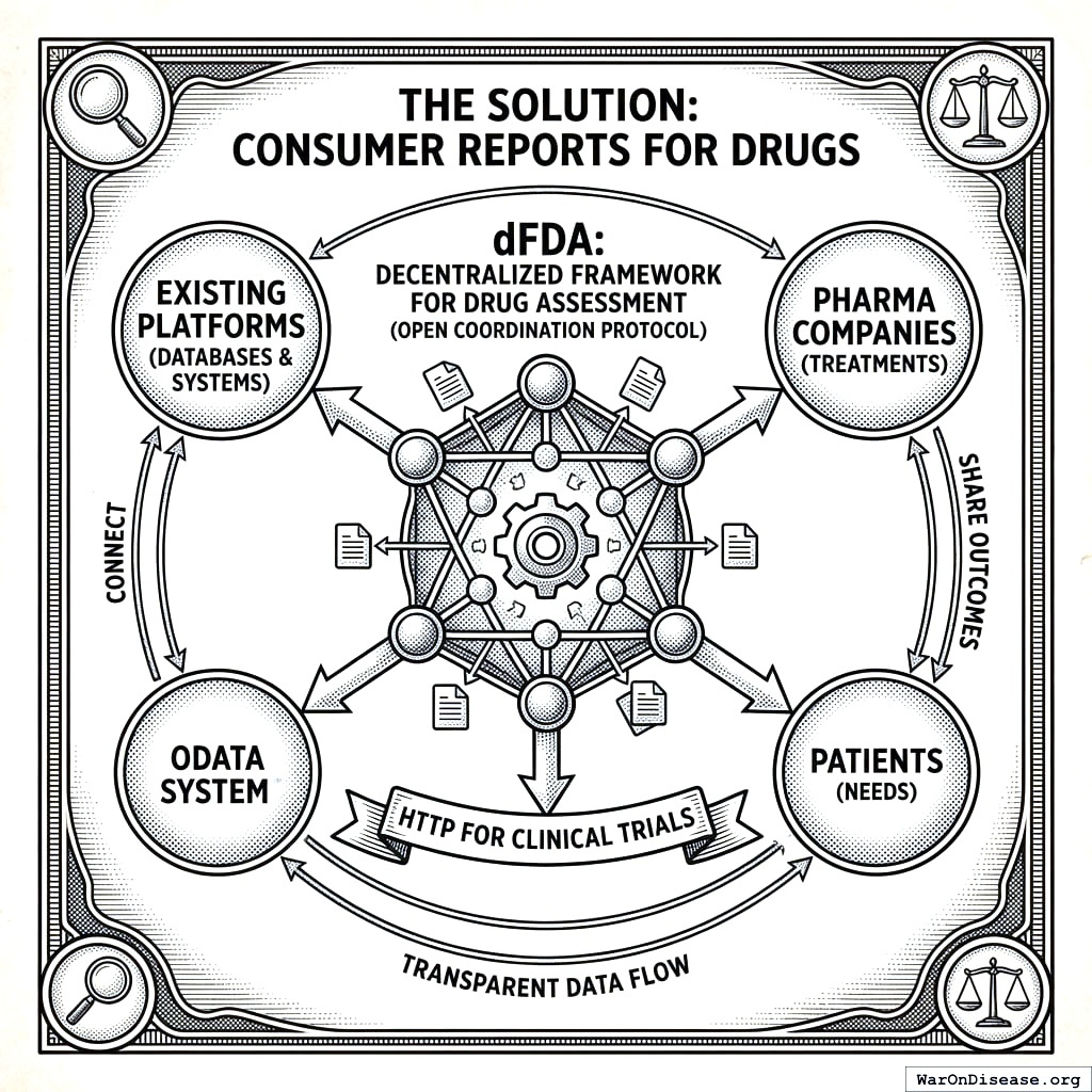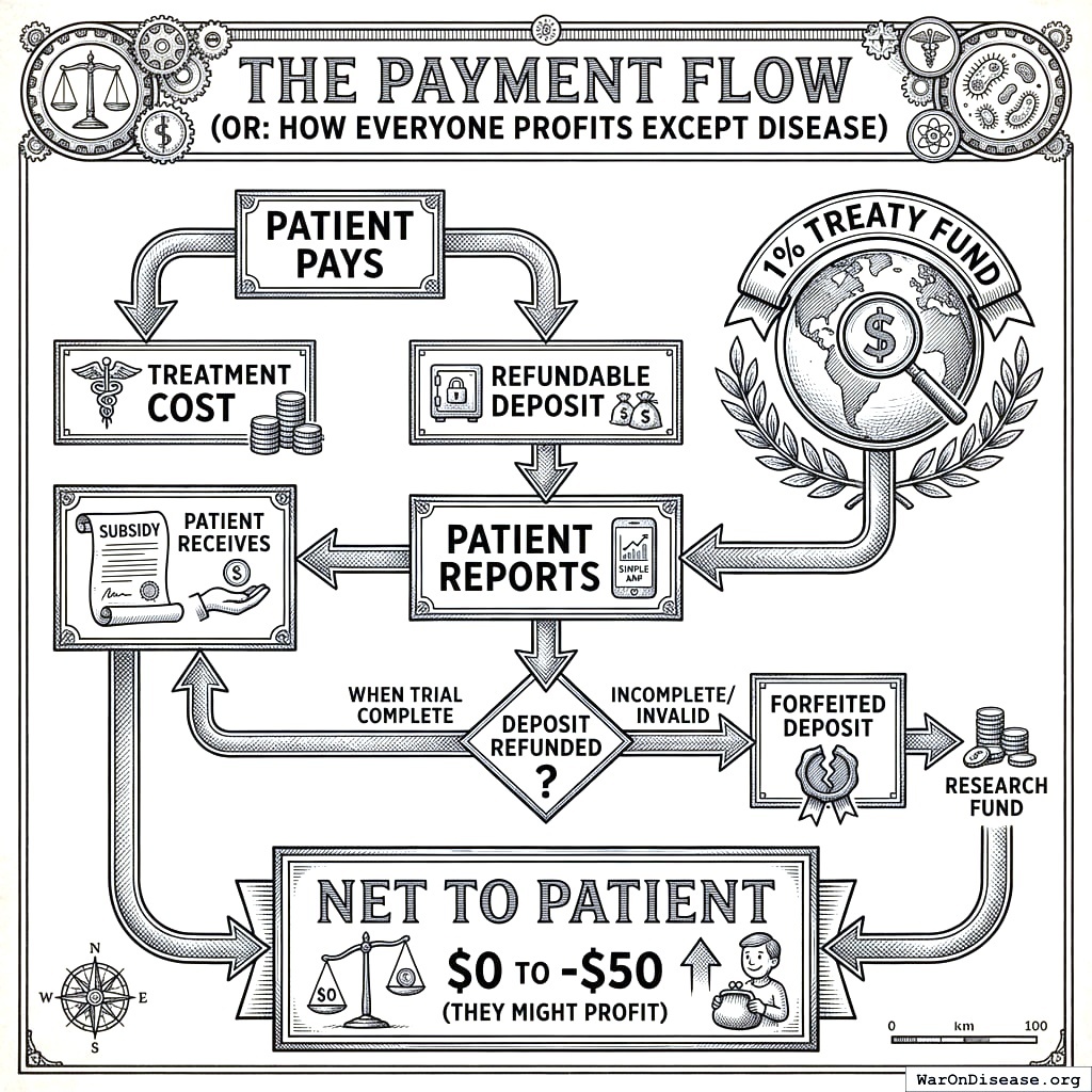 Your framework fixes that. Your pharmacy becomes a trial site. Your doctor becomes a researcher. Your dying becomes data.