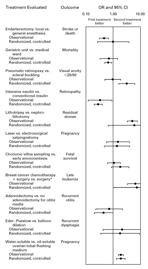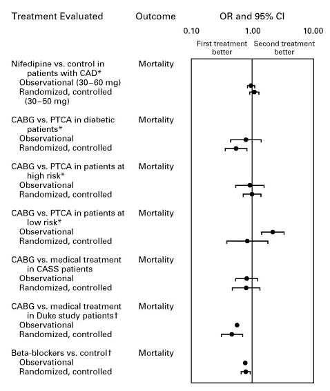 Forest plot comparing effect sizes from observational studies vs. RCTs for cardiac treatments. The dots land in the same place. The expensive method and the cheap method found the same answers.