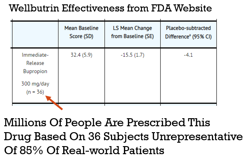 Trials are designed to test drugs on people who don’t actually exist. To get into a study for an antidepressant, you can’t have any other pesky problems like anxiety or PTSD. You can’t have a history of drug or alcohol use. You can’t be on other medications. You have to be the perfect kind of sick. The result? Only about 14%3,148 of real-world patients with depression would actually qualify. The patients who will actually be taking the drug are too messy for their pristine, clean data.