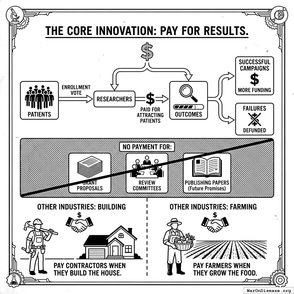 Every dollar flows based on results, not promises. Patients vote with their enrollment. Researchers get paid for attracting them. Things that work get more funding. Things that don’t get defunded. Nobody gets paid for writing grant proposals or publishing papers about why their research might work someday. This is how every other industry works. You pay contractors when they build the house, not when they promise to. You pay farmers when they grow the food, not when they apply for a farming license. Medicine went the other way (for reasons nobody can explain, and which I suspect don’t exist).