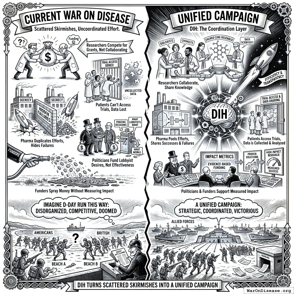 Imagine if D-Day had been run this way. The Americans land at one beach, the British at another. Neither tells the other what they learned. Both compete for the same supply ships while the enemy reads their grant applications. This is how your species currently runs medical research, and you’ve been doing it long enough that it feels normal, which is the most dangerous thing about it.
