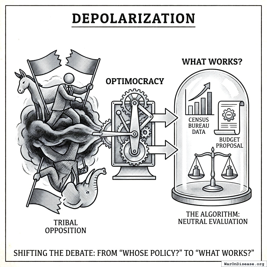 10.5281/zenodo.18356213 Thousands of jurisdictions have made different policy and budget choices over decades, creating a natural experiment. Optimocracy applies causal inference to this cross-jurisdictional time-series data to identify which policies predict above-average median income and healthy life years. It then publishes evidence-based recommendations for every major vote, tracks politician alignment, and funds aligned candidates via SuperPAC, making suboptimal policy politically expensive while preserving democratic structures.