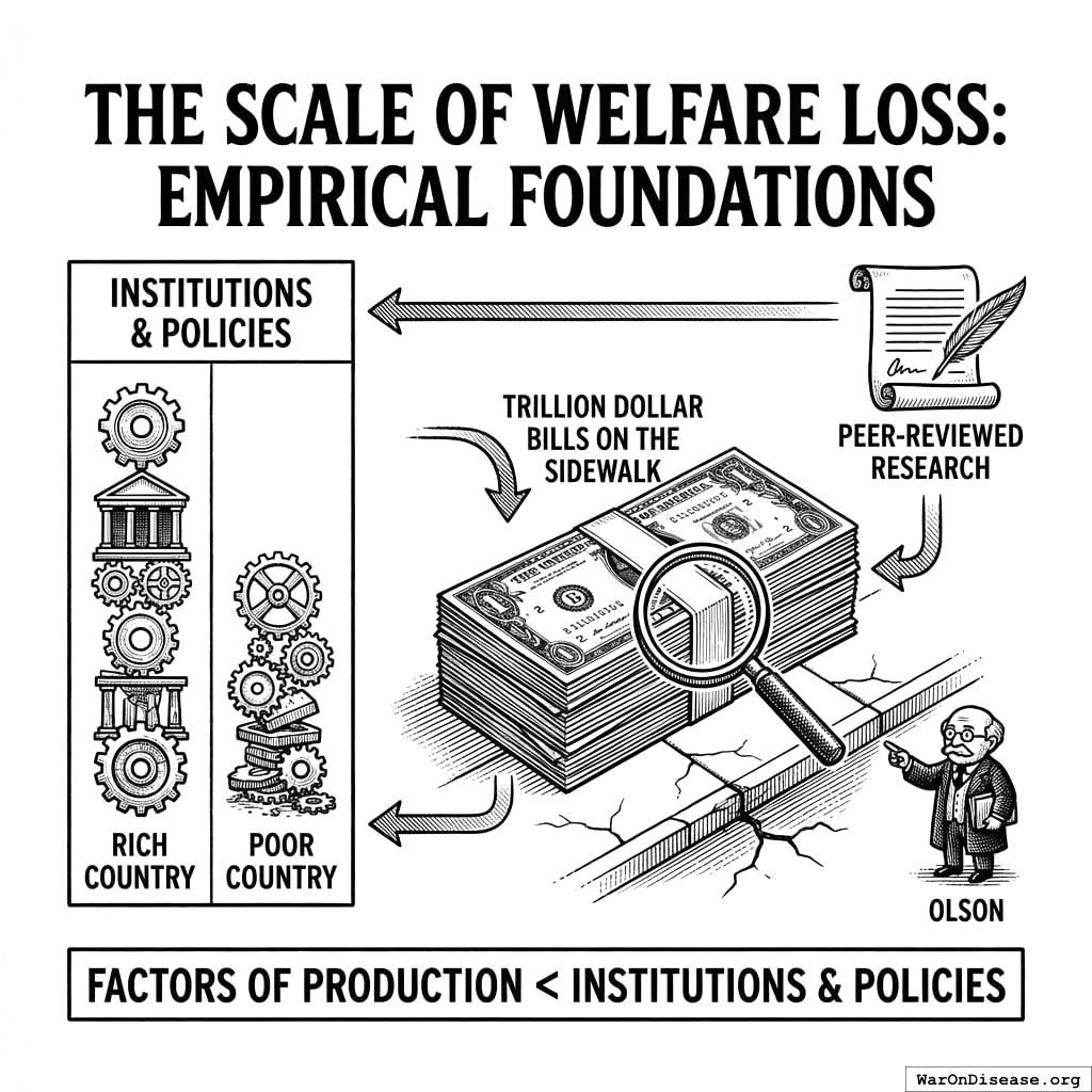 Documented US governance waste totals $4.9 trillion (95% CI: $3.62 trillion-$6.5 trillion) (17% (95% CI: 12.6%-22.6%) of GDP). Globally, the opportunity cost of suboptimal policy reaches $101 trillion (95% CI: $83.3 trillion-$191 trillion) (87.8% (95% CI: 72.5%-166%) of GDP), putting your civilization’s governance efficiency at 51.9% (95% CI: 35.9%-57%). Your species is running at roughly half its technological potential. Imagine building a car, then only turning on half the cylinders because the other half are controlled by a committee that meets once a year and disagrees about what “forward” means. (For the full accounting, see the Political Dysfunction Tax51 and US Efficiency Audit147.)