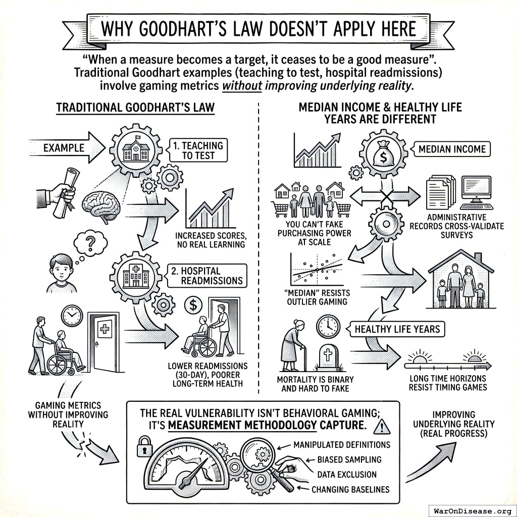 Why not 50 metrics? Because each additional target creates a new way to cheat, and your species needs no encouragement in that department. Markets figured this out: firms optimize profit, not 200 sub-metrics. Two broad, hard-to-fake numbers are easier to audit than 50 narrow ones. And these particular numbers are very hard to fake. You can’t fabricate purchasing power at scale without actually improving household economics. Mortality is binary (the most binary thing there is). You can’t fake everyone being “less dead.”