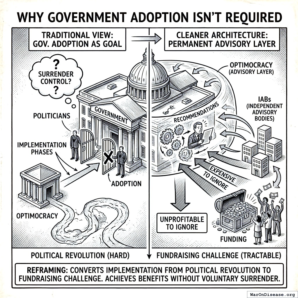 This doesn’t require government permission. The Evidence Machine operates as a permanent advisory layer outside government. Politicians still vote however they want. They can still ignore the evidence; it just costs them money now, which on Earth is apparently the only consequence that matters. The question isn’t “will politicians give up power?” (they won’t) but “can we make ignoring good advice unprofitable?” (yes; it’s a fundraising challenge, not a revolution).