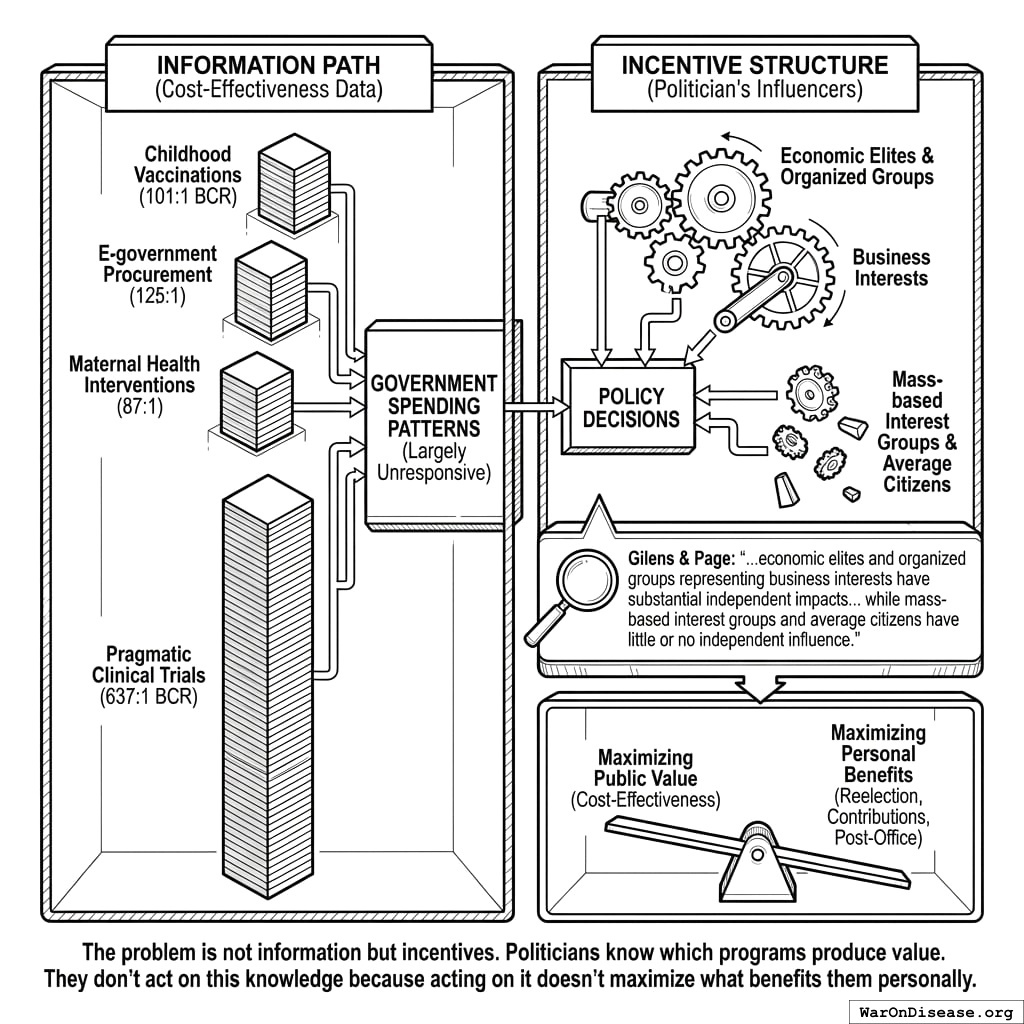 Why? Because information doesn’t change incentives. A Princeton study analyzed 1,779 policy decisions and found that average citizens have “little or no independent influence” on policy outcomes153. Economic elites and organized interest groups drive policy. You already knew this (it’s covered in Unrepresentative Democracy). The point here is that publishing better data doesn’t fix the problem. Your politicians already know which programs produce value. They don’t act because acting doesn’t maximize getting votes, getting papers, or getting a nice job afterward selling access to their replacements.